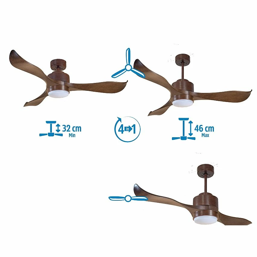 Le moteur à courant continu DC2 de couleur marron permet des installations sur des plafonds jusqu’à 27º d’inclinaison et est servi avec deux tiges pour une installation à la hauteur appropriée (13,5 cm et 25 cm). Il est parfait pour 2 ou 3 pales, car il dispose d’une fonction auto équilibrée. Il prend également en charge le kit de lumière. Ce modèle est réversible, désestratificateur d’air, de sorte qu’en hiver, vous pouvez inverser ses pales pour que son mouvement déplace l’air chaud vers le bas, agissant en complément de votre système de chauffage et favorisant une consommation optimisée. Il comprend également un thermostat à sa base, de sorte que vous pouvez le programmer pour que le ventilateur fonctionne en fonction de la température ambiante.