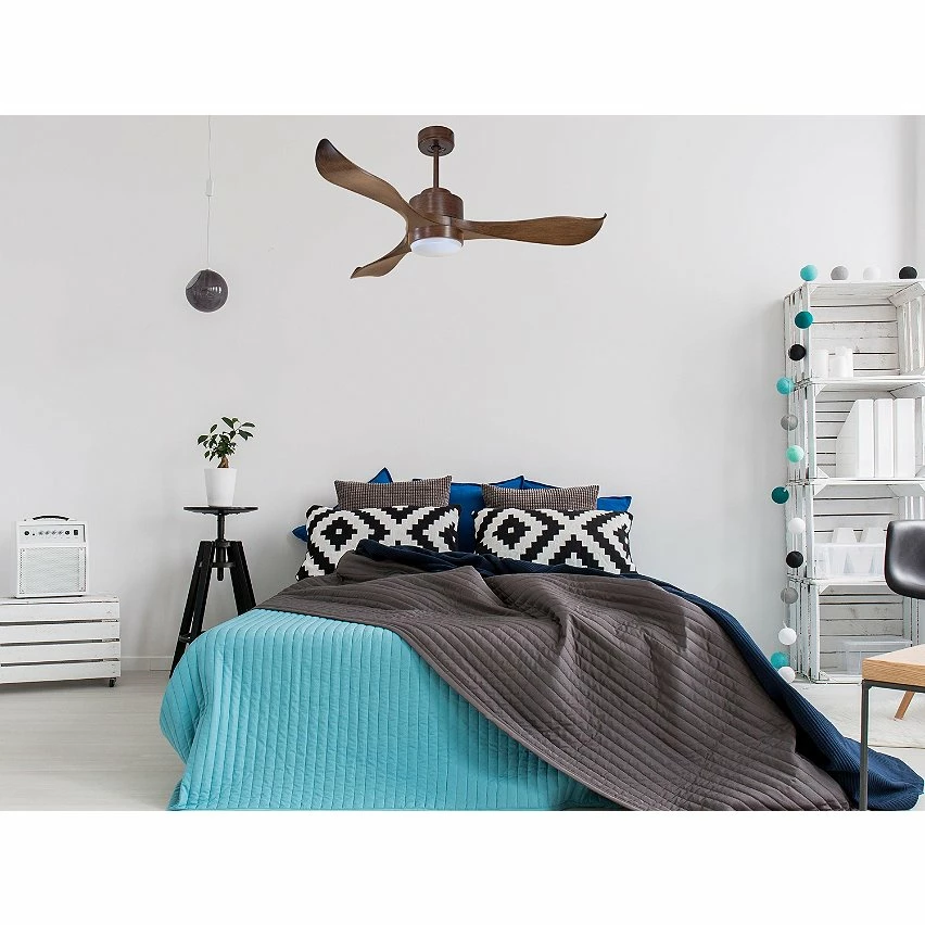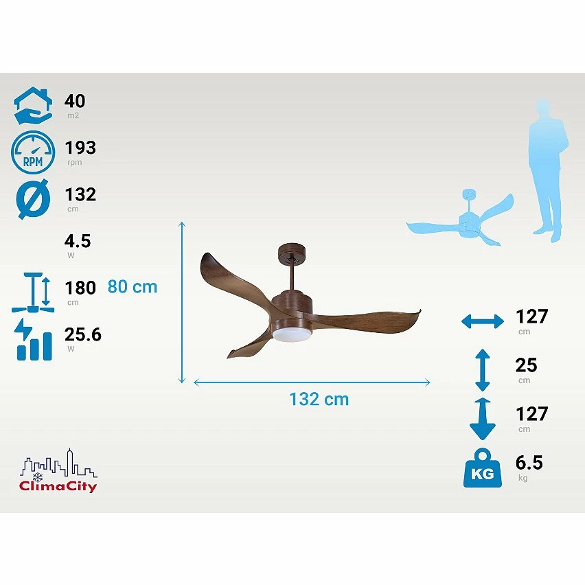 Les pales aérodynamiques en ABS confèrent au ventilateur une grande légèreté, et ont été traitées à la main pour être totalement équilibrées et ne pas produire de vibrations. Ce modèle à 3 Pales marron a un diamètre de 132 cm et atteint une grande vitesse.