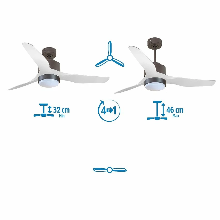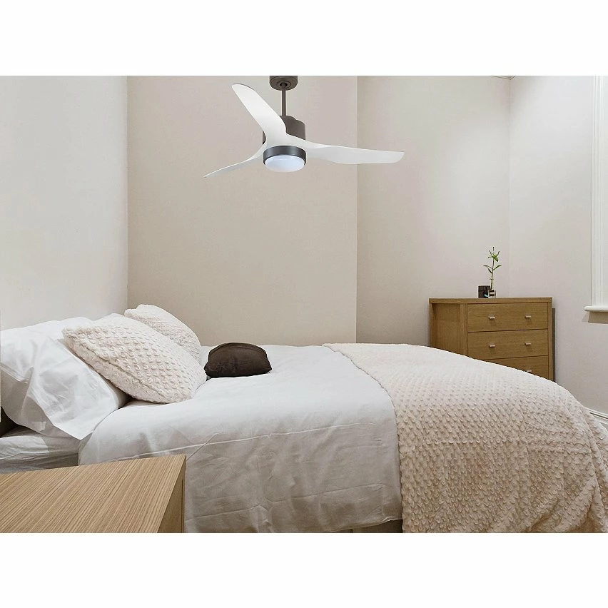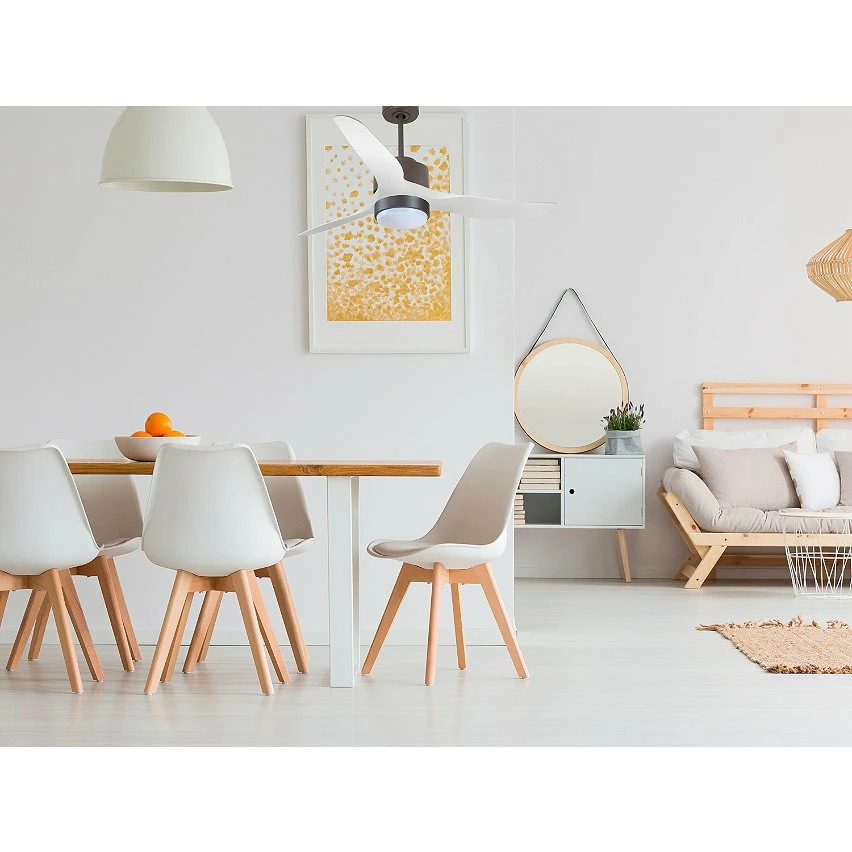 Le moteur Ă courant continu noir DC6 permet des installations dans les plafonds jusqu’Ă 27Âș d’inclinaison et est servi avec deux tiges pour ĂȘtre installĂ© Ă la hauteur appropriĂ©e (13,5 cm et 25 cm). Il est parfait pour 2 ou 3 pales, car il dispose d’une fonction auto Ă©quilibrĂ©e. Il prend Ă©galement en charge le kit de lumiĂšre. Ce modĂšle est rĂ©versible, dĂ©sestratificateur d’air, de sorte qu’en hiver, vous pouvez inverser ses pales pour que son mouvement dĂ©place l’air chaud vers le bas, agissant en complĂ©ment de votre systĂšme de chauffage et favorisant une consommation optimisĂ©e. Il comprend Ă©galement un thermostat Ă sa base, de sorte que vous pouvez le programmer pour que le ventilateur fonctionne en fonction de la tempĂ©rature ambiante.