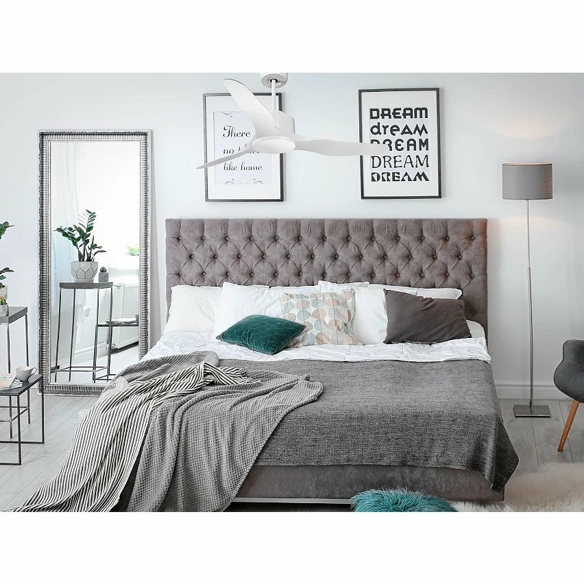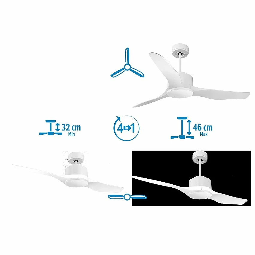 Le moteur à courant continu blanc DC4 permet des installations dans les plafonds jusqu’à 27º d’inclinaison et est servi avec deux tiges pour être installé à la hauteur appropriée (13,5 cm et 25 cm). Il est parfait pour 2 ou 3 pales, car il dispose d’une fonction auto équilibrée. Il prend également en charge le kit de lumière. Ce modèle est réversible, désestratificateur d’air, de sorte qu’en hiver, vous pouvez inverser ses pales pour que son mouvement déplace l’air chaud vers le bas, agissant en complément de votre système de chauffage et favorisant une consommation optimisée. Il comprend également un thermostat à sa base, de sorte que vous pouvez le programmer pour que le ventilateur fonctionne en fonction de la température ambiante.