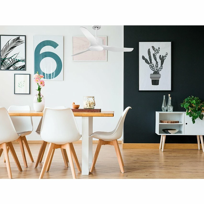 Les pales aérodynamiques en ABS confèrent au ventilateur une grande légèreté, et ont été traitées à la main pour être totalement équilibrées et ne pas produire de vibrations. Ce modèle à 3 Pales de couleur blanc a un diamètre de 127 cm et atteint une grande vitesse.