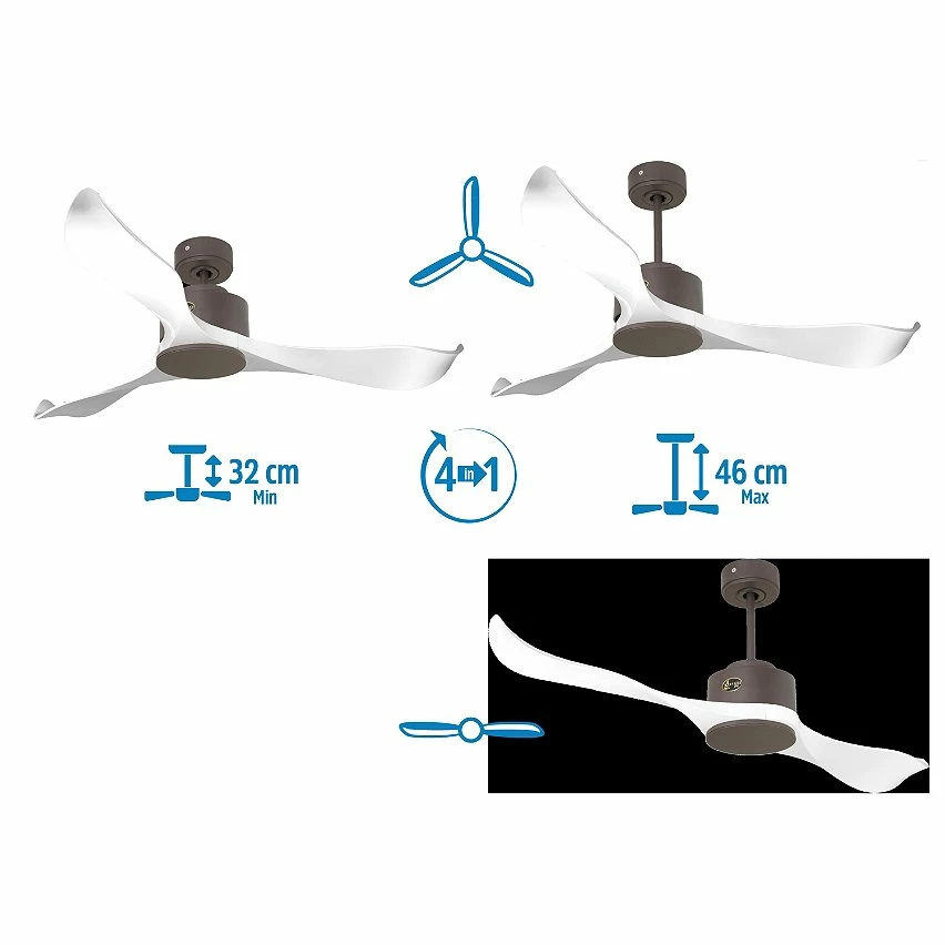 Le moteur à courant continu noir DC6 permet des installations dans les plafonds jusqu’à 27º d’inclinaison et est servi avec deux tiges pour être installé à la hauteur appropriée (13,5 cm et 25 cm). Il est parfait pour 2 ou 3 pales, car il dispose d’une fonction auto équilibrée. Il prend également en charge le kit de lumière. Ce modèle est réversible, désestratificateur d’air, de sorte qu’en hiver, vous pouvez inverser ses pales pour que son mouvement déplace l’air chaud vers le bas, agissant en complément de votre système de chauffage et favorisant une consommation optimisée. Il comprend également un thermostat à sa base, de sorte que vous pouvez le programmer pour que le ventilateur fonctionne en fonction de la température ambiante.
