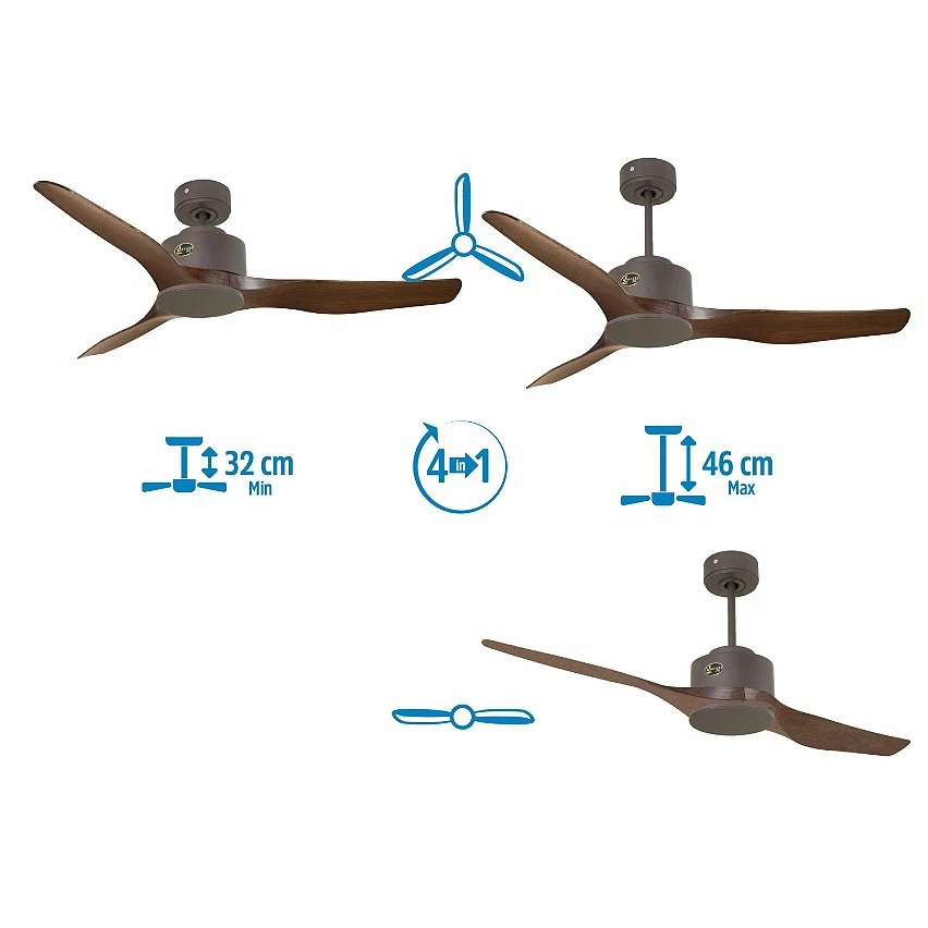 Les pales aérodynamiques en ABS confèrent au ventilateur une grande légèreté, et ont été traitées à la main pour être totalement équilibrées et ne pas produire de vibrations. Ce modèle à 3 Pales marron a un diamètre de 127 cm et atteint une grande vitesse.