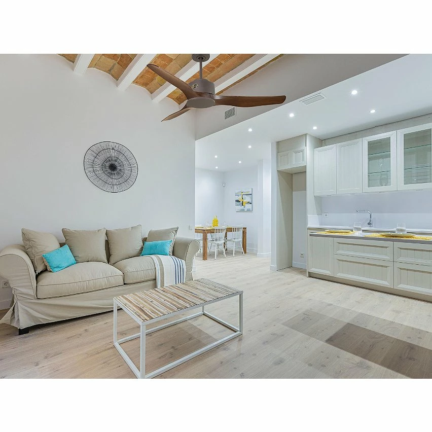 Le moteur à courant continu noir DC6 permet des installations dans les plafonds jusqu’à 27º d’inclinaison et est servi avec deux tiges pour être installé à la hauteur appropriée (13,5 cm et 25 cm). Il est parfait pour 2 ou 3 pales, car il dispose d’une fonction auto équilibrée. Il prend également en charge le kit de lumière. Ce modèle est réversible, de sorte qu’en hiver, vous pouvez inverser ses pales pour que son mouvement déplace l’air chaud vers le bas, agissant en complément de votre système de chauffage et favorisant une consommation optimisée. Il comprend également un thermostat à sa base, de sorte que vous pouvez le programmer pour que le ventilateur fonctionne en fonction de la température ambiante.
