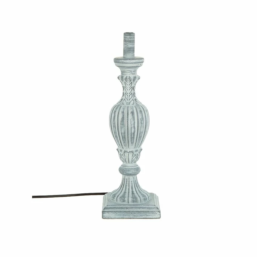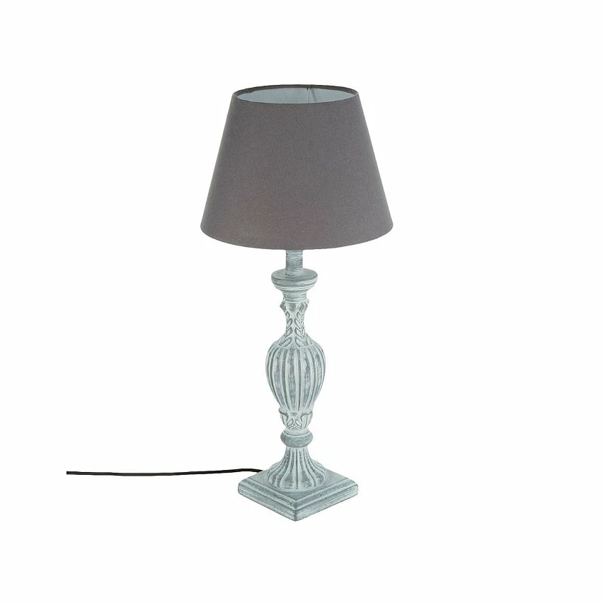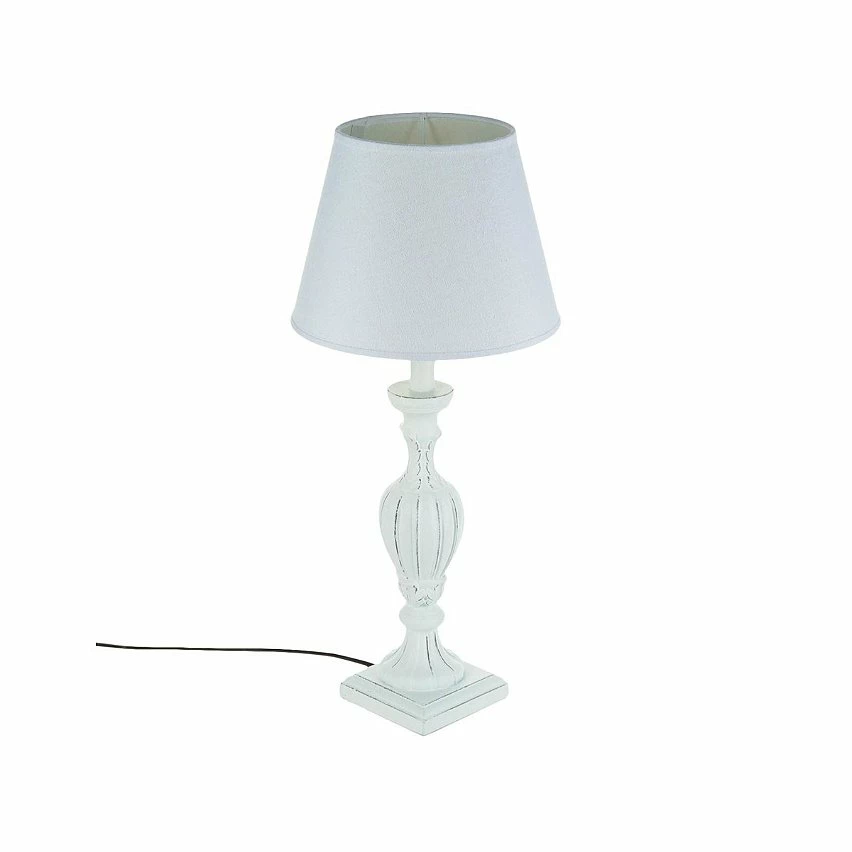 Lampe en bois patiné blanc ou gris. Hauteur 56cm. Fonctionne sur secteur et avec une ampoule E27 de 40w maximum.