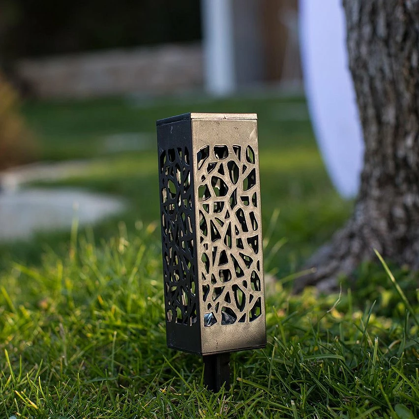 ROBUSTE : l’éclairage extérieur solaire Organic, protégé contre les éclaboussures (IP44) et résistant aussi aux UV, fait une hauteur totale de 28cm (pique inclus) et une largeur de 6cm. Son motif moucharabieh lui confère un aspect esthétique qui lui permettra de se fondre complètement dans votre décoration extérieure.