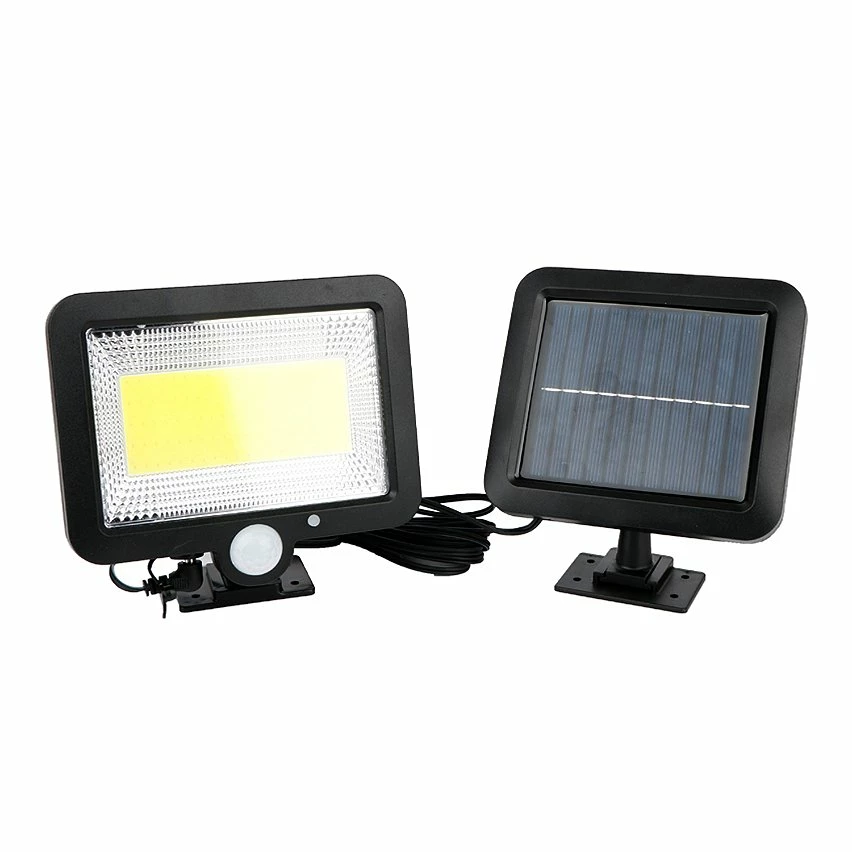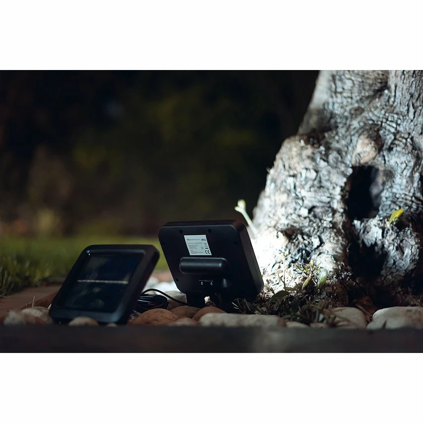 . Détecteur de luminosité. Waterproof IP65. Modes : Veille, Veille+Détecteur de mouvements, Détecteur de mouvements. Revêtement plastique ABS. Batterie de 400 mAh. Temps de charge de 8h. Autonomie de 10-12h. Panneau solaire déporté pour une meilleure captation de la lumière solaire