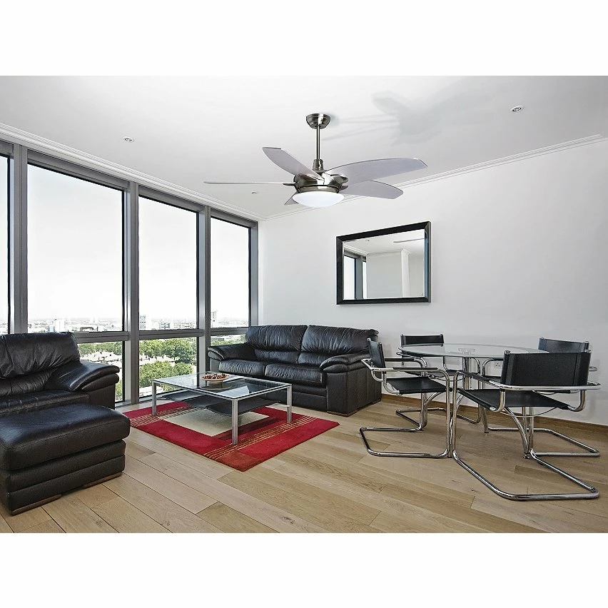 Son design en finition chrome argent est élégant et léger. Sa hauteur (60cm), son poids (9,5kg), ses 5 pales (chêne/argent) et son diamètre (132cm) le rendent idéal pour les pièces jusqu’à 35m2. Parmi ses accessoires, vous trouverez un kit d’installation, une télécommande et une commande murale.