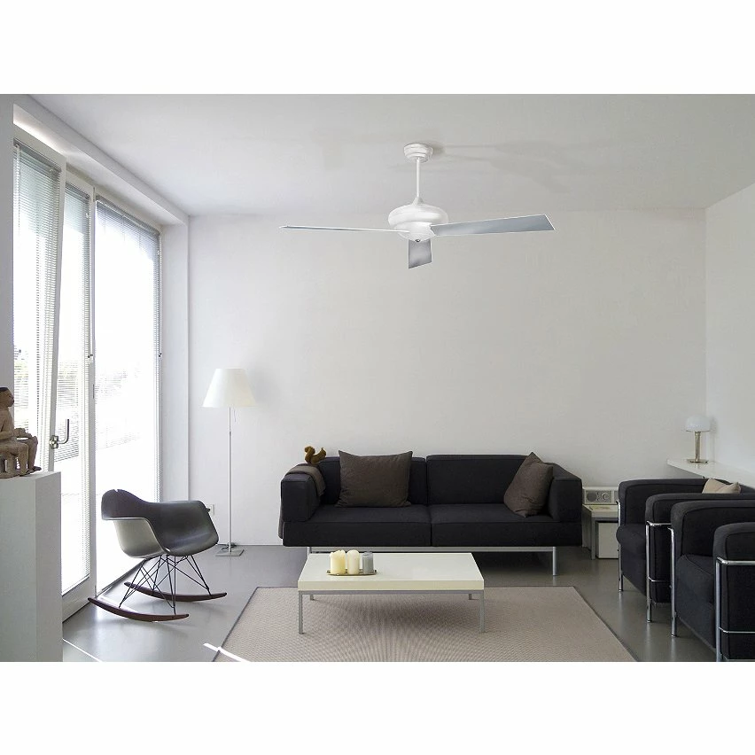Son design blanc est simple, moderne et léger. Sa hauteur (62cm), son poids (7,5kg), ses 3 pales en blanc et argent et son diamètre (132cm) le rendent idéal pour les pièces jusqu’à 40m2. Parmi ses accessoires, vous trouverez un kit d’installation et une commande murale.