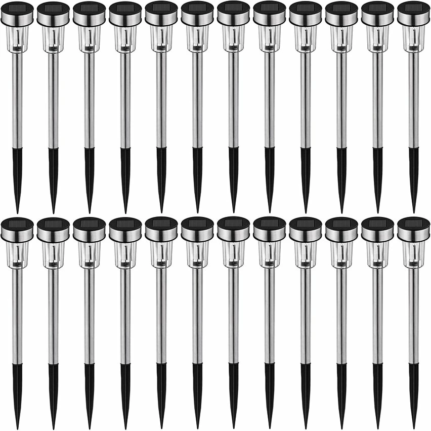 Lot de 24 Balises Bornes Lampes Solaires à LED Multicolor, Lampes de Jardin Piquets Éclairage Extérieures 37 cm x 4,7 cm Gris TECTAKE. • Ne cherchez plus : Ces lampes solaires à LED sont l’éclairage d’extérieur qu’il vous faut ! • Elles diffusent une lumière BLANC FROID et créent une ambiance agréable dans l’obscurité. • L’éclairage à LED grâce à son alimentation solaire embellira votre allée, votre balcon, votre jardin, votre terrasse ou tout autre espace extérieur difficile à atteindre. • Grâce à leur fonction solaire, les lampes à LED de jardin sont écologiques et économiques en électricité. • Elles évitent également l’utilisation de câbles inutiles et le raccordement à des prises secteur. • Plantez-les ou fixez -les aux endroits voulus et laissez agir le soleil. • La durée de vie des lampes à LED est largement supérieure à celle des autres lampes traditionnelles. • L’énergie solaire accumulée pendant la journée est ensuite transformée en lumière. • La lampe solaire est dotée d’un capteur crépusculaire qui vous assure plus de confort, elle s’allume automatiquement dès que la lumière du jour n’est plus suffisante. • A l’aide de l’interrupteur situé sous le cylindre en métal, vous pourrez choisir d’allumer ou d’éteindre la lampe au gré de vos envies. • Ces lampes solaires sont robustes et résistantes aux intempéries. • L’installation est rapide et facile.
