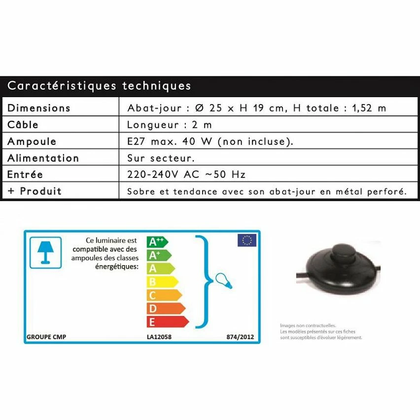 - Abat-jour : D. 25 x H. 19 cm