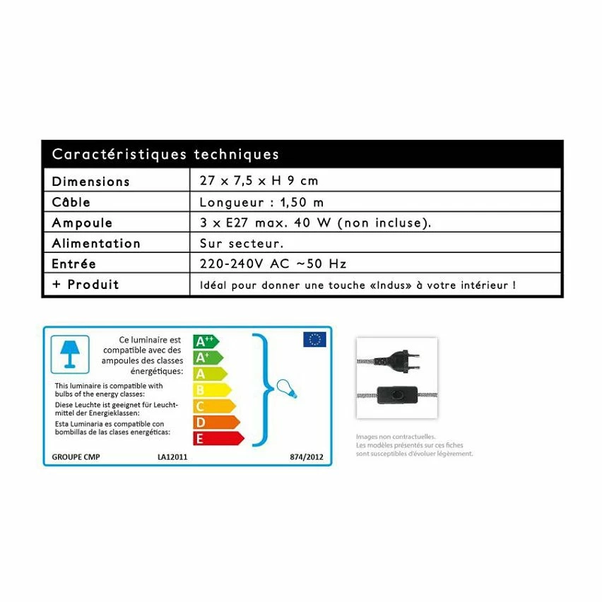 Ampoule : 3 x E27 max 40W (non incluses)