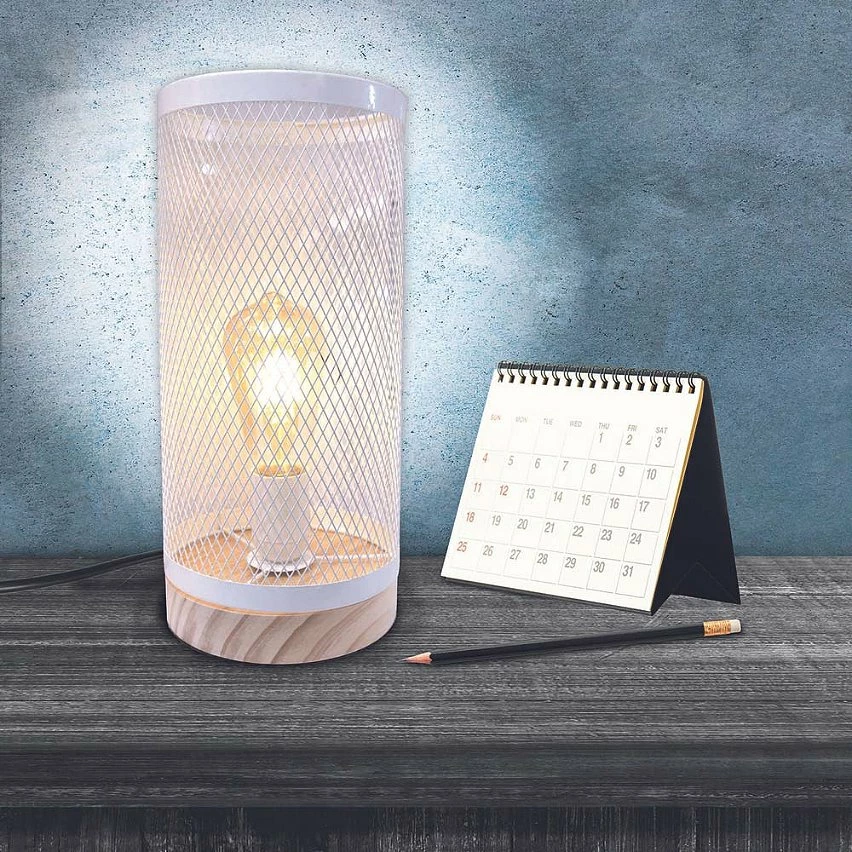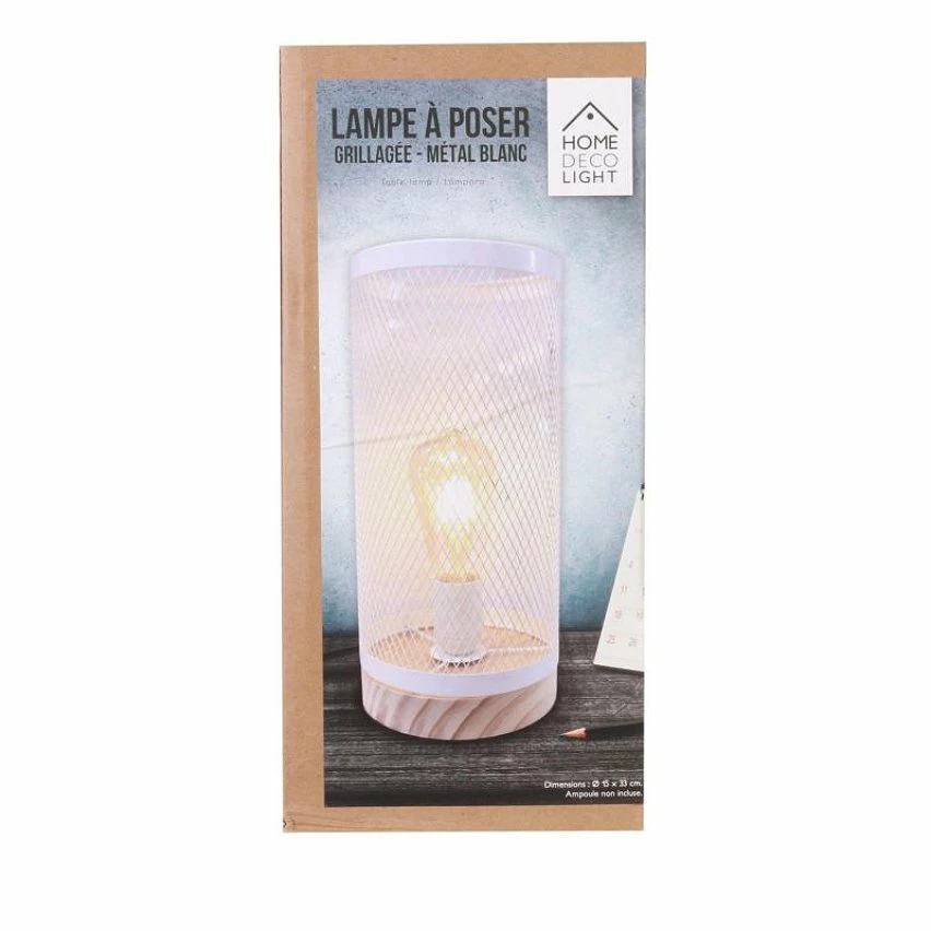 Lampe cylindrique métal grillagé socle en bois