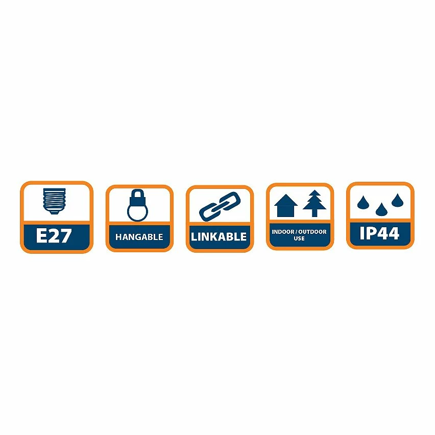 Guirlande de couleur blanche, 20 douilles E27, longueur totale 20 m, distance entre chaque douille 0,925 m. Pour une utilisation en intérieur ou en extérieur. Possibilité de connecter plusieurs cordons en série (jusqu’à 3 du même type) grâce au connecteur terminal. Ampoules non incluses. Câble H05RN-F 2 x 1 mm2, spécial pour l’extérieur (IP44). Chaque douille est munie d’un œillet pour l’accrocher. Tension d’entrée : 220/240 V ~ 50/60 Hz. Maximum: 25W par culot